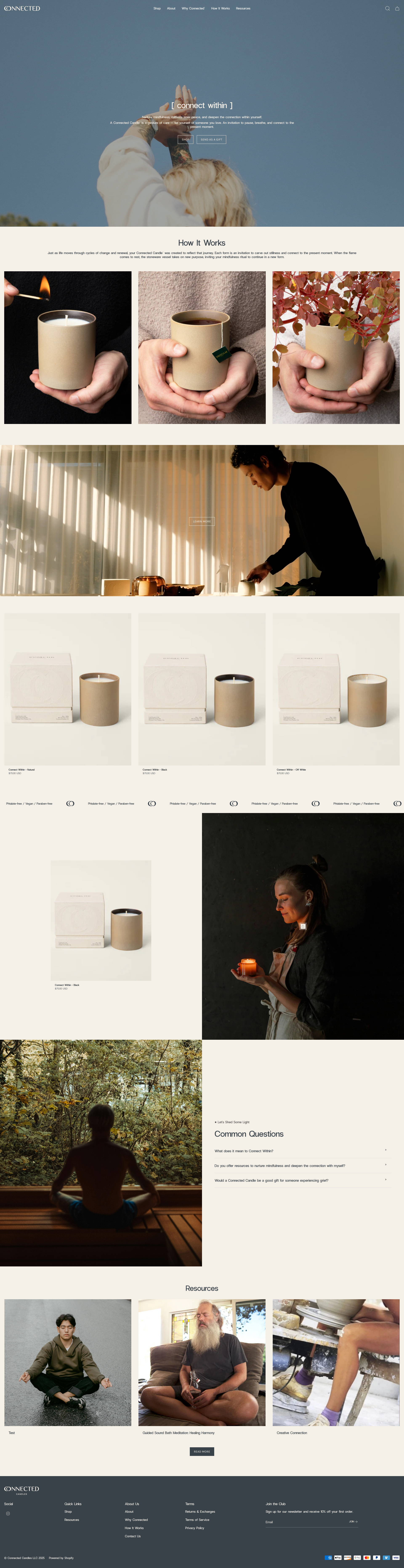 Connected Candles is an e-commerce brand centered on creating meaningful, intentional gifting experiences. “In a world that rarely slows down, a Connected Candle offers more than light. It is a quiet ritual — an invitation to soften your breath, quiet the noise, and return to yourself.” The website was designed to bring this vision to life through thoughtful storytelling, minimalist design, and a simple user experience. Whether a customer is purchasing a candle for themselves or as a gift for someone else, the process should feel calm and restorative. By blending the new brand identity created by another designer with the founder’s distinct vision, we crafted an online experience that feels both elevated and deeply personal.